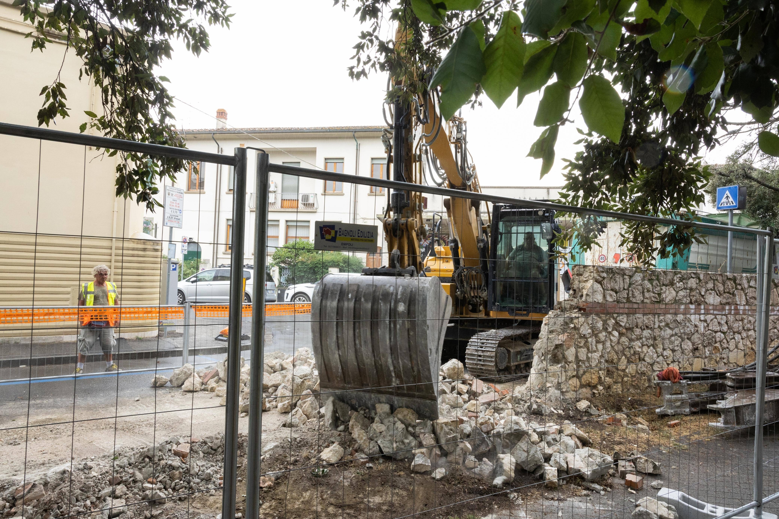 Il muro è stato buttato giù inizialmente nella parte a nord, per circa 30 metri. I lavori proseguono di buona lena, considerando che il muro 'segue' il parco lungo via Bisarnella per circa 150 metri.