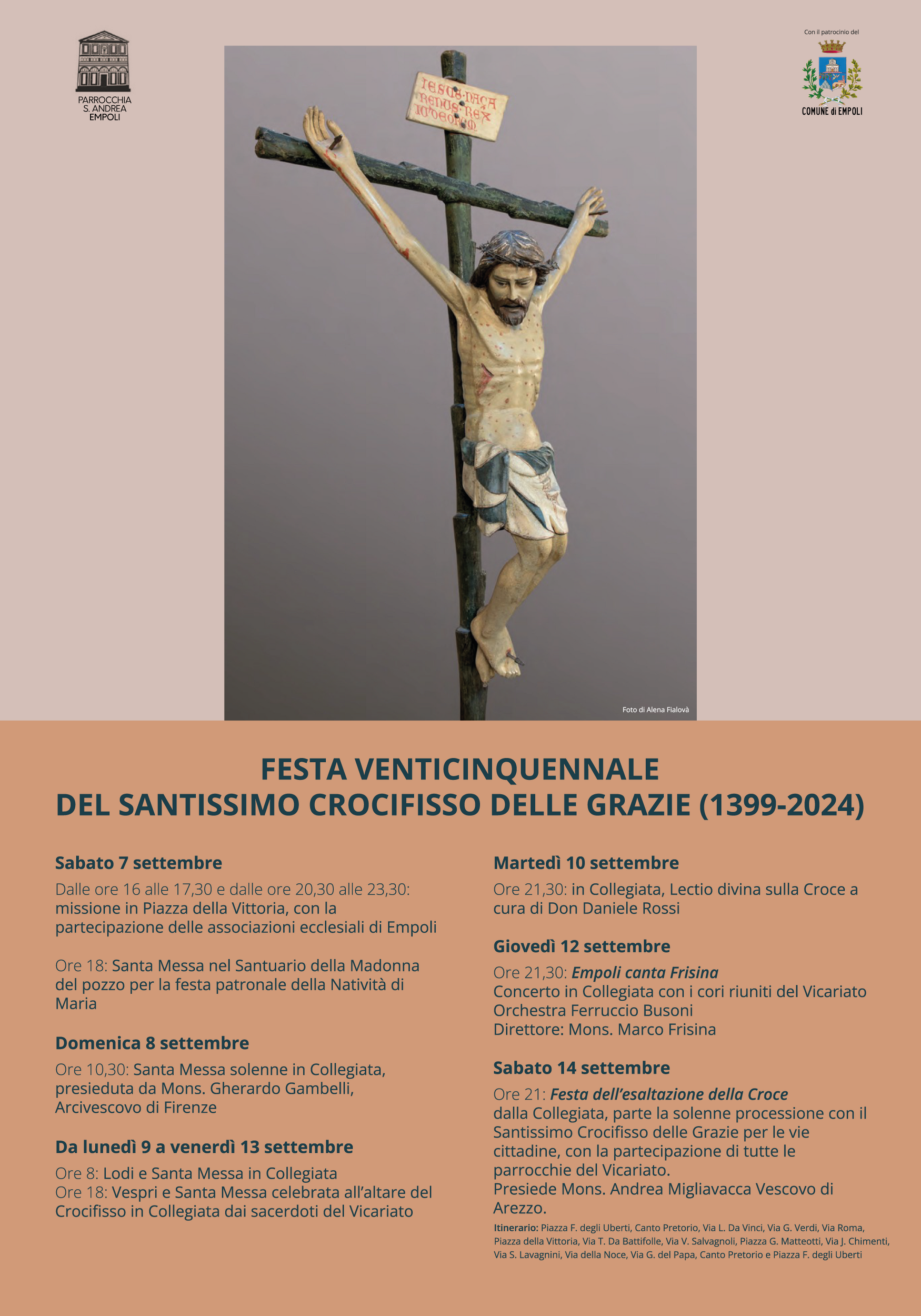 Il prossimo sabato 14 settembre ricorre un anniversario speciale per la comunità empolese. Si svolgerà infatti la processione del Crocifisso delle Grazie della Collegiata di Sant'Andrea, un manufatto ligneo risalente alla seconda metà del '300, che ogni 25 anni viene portato in processione per la città. L'ultimo appuntamento risale al 1999 e quest'anno ricorrono i 25 anni anche se nel 2020, nei mesi più bui della pandemia, ci fu una processione straordinaria guidata dall'allora Arcivescovo di Firenze, cardinal Giuseppe Betori.