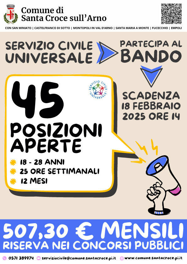 Il Comune di Empoli come ogni anno ha infatti partecipato al bando per la selezione di quarantacinque volontari il cui ente titolare è il Comune di Santa Croce sull'Arno. I progetti sono cinque e si realizzeranno fra il 2025 e il 2026 sul territorio dei comuni coinvolti: oltre a Santa Croce sull'Arno, sono interessati Empoli, Fucecchio, Castelfranco di Sotto, Montopoli in Val d'Arno, San Miniato, Santa Maria a Monte e la Società della Salute Empolese Valdarno Valdelsa.